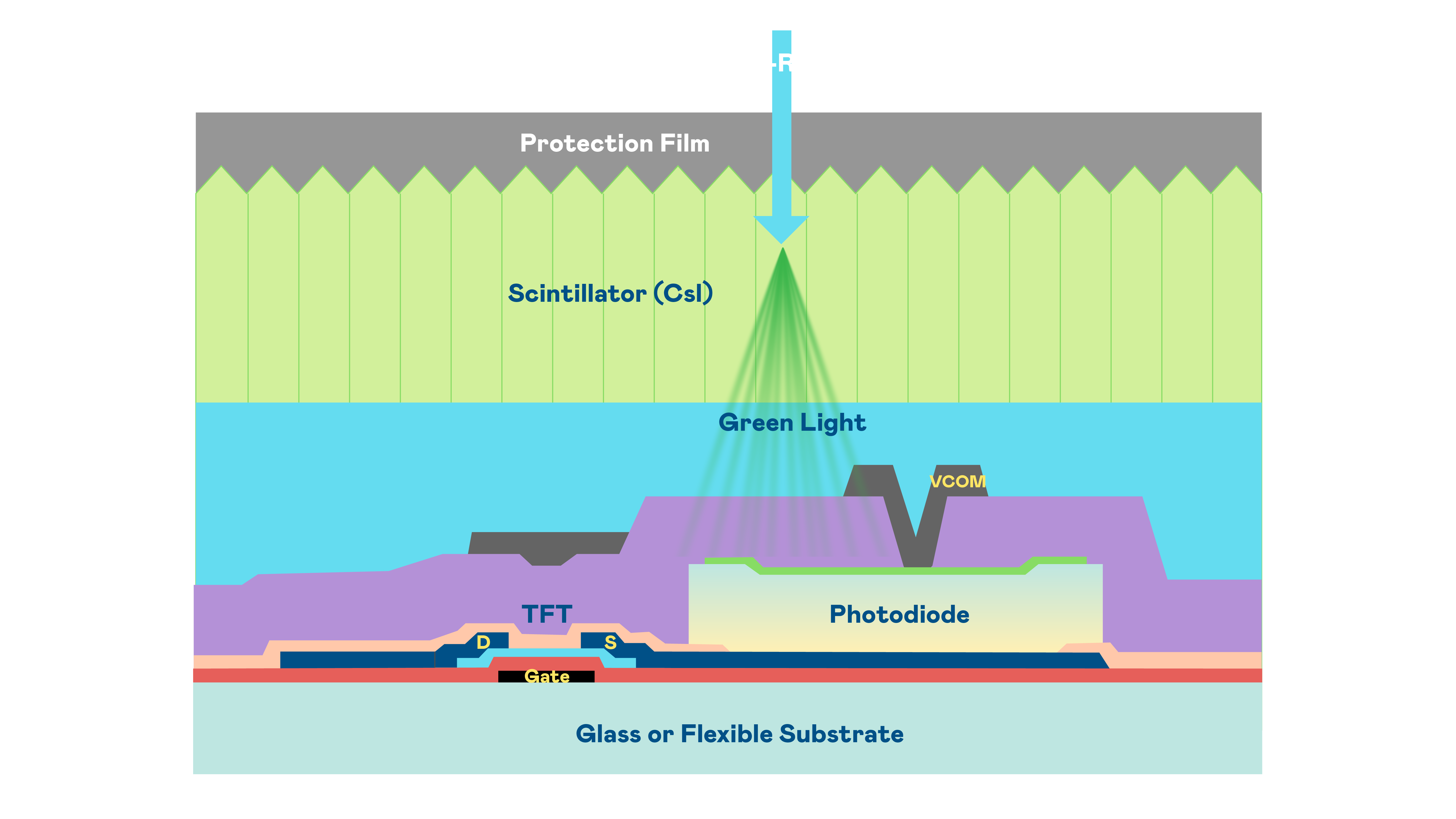 太阳集团7237的X光影像感測陣列使用薄膜電晶體 (TFT) 作為每個像素的讀取開關,搭配光電二極體(Photodiode)的光電轉換元件,用以感測X光影像訊號。